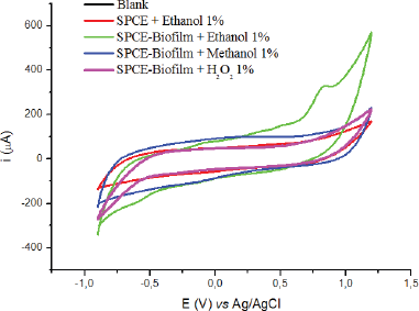Characterization of biosensors was performed electrochemically using the cyclic voltammetry techniques. The cyclic voltammetry technique was chosen, because it has several advantages among others. The advantage of the cyclic voltammetry technique be able to detect peak currents for qualitative and quantitative analysis, and can be used to study the reversibility of electron transfer [37]. Characterization of biosensors was carried out to ensure that the produced current only came from the specific reaction between ethanol and the PQQ-ADH enzyme in A. aceti. Characterization was done by measuring 1% ethanol used an electrode (SPCE) without adding bacteria to ensure that produced current is only by a catalytic reaction. These results indicate that the pure SPCE electrode cannot oxidize ethanol which acts as an analyte, so the reaction is truly enzimatic reaction. Furthermore, biosensor characterization was taken by testing 1% ethanol, 1% methanol, and 1% H2O2. In some cases of biosensors, H2O2 is an intermediate product which compared with the amount of reagent. The current absence in 1% H2O2 indicates, the intermediate product is not formed. Checking for 1% methanol was done to find out the type of enzyme in A. aceti biofilm that reacted to ethanol. Methanol is also chosen, because these compounds usually appear in alcoholic fermentation processes. Acetobacter aceti has specific activity on short chain of alcohols except methanol [15]. Bilgi et al. [38] also compared the performance of ADH and AOX enzyme-based biosensors to ethanol, methanol, and their mixture. The result is shown that the AOX enzyme produces higher oxidation current toward methanol than ethanol at the same concentration, while ADH is more specific to ethanol. In this research, the methanol response of biosensors in the voltage range of −0.9 to +1.2 V was almost undetectable. The resulting peak was not clearly visible, with the shape almost equaling the blank (Fig. 2). The result confirms that the enzymatic reaction truely produced by PQQ-ADH enzymes. This clearly makes A. aceti more potential to be used as a bioreceptor, because it produces a specific reaction.