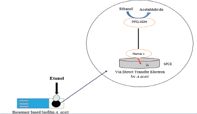 Detection of ethanol is carried out by measuring the oxidation current resulting from the reaction between the substrate and the PQQ-ADH enzyme contained in A. aceti biofilm as bioreceptor. Acetobacter aceti does not require mediators for the transfer of electrons, so it can be effective direct electron transfer [39,40]. The direct bioelectrocatalysis of A. aceti cells, because it has two cofactors that work simultaneously [41]. The enzyme consists of subunits I (adhA), II (adHB), and III (adHS) [17]. Redox reactions occur in subunits I. Subunit I consists of a ADH enzyme in the periplasmic which depends on 1 molecule PQQ as coenzyme and 1 molecule of heme c as a prosthetic group. PQQ functions is to increase catalytic activity, while heme c functions as mediator for electrons transfer to electrode [41,42]. Ethanol is oxidized by the enzyme to produce acetaldehyde. Reduction of PQQ to PQQH2 was produced two electrons. Then, electrons were transferred directly out of the membrane through heme c moiety. Heme c in A. aceti has an iron ion coordinated to porphyrin which responsible for electron transfer in some biological systems. So, this biosensor reaction is based on direct bioelectrocatalysis reaction. The substrate recognition reaction scheme is represented in Figure 3.