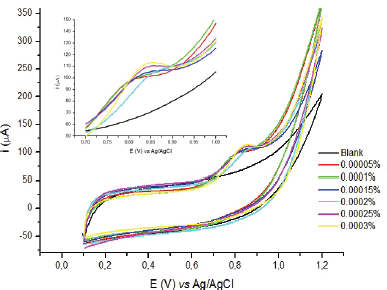 ![]() | Figure 4: Cyclic voltamogram of dependent concentration and current with υ = 200 mV s−1. [Click here to view] |