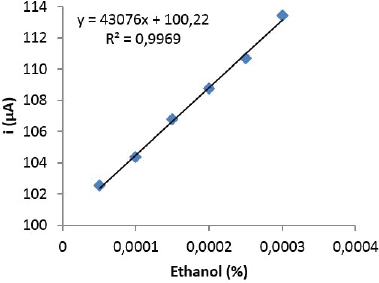 The biosensor that had been designed under optimum conditions was tested for analytic performance using the cyclic voltammetry techniques. The experimental conditions in analytical performance testing are similar to the testing of biosensor characteristics, but the used of potential range is shortened to +0.1–1.2 V because anodic current only appeared around 0.83–0.92 V. It aims to accelerate the reaction process and reduce the occurrence of fatigue of bacteria in producing enzymes. The longer scanning time might cause death to bacteria. The analytical performance of biosensor was summarized as follows. The linearity range used for measuring sensitivity, LOD and LOQ was from 0.00005% to −0.0003%. The determination coefficient (R2) value obtained was 0.9969, which means that as much as 99.69% of current changes are affected by increasing in ethanol concentration (Fig. 4). The obtained sensitivity was quite large, namely 43,076 μA%−1 or equal to 251.42 μA mM−1 (Fig. 5). The obtained detection and quantization limits were 2.32 × 10−5 and 7.03 × 10−5%, respectively. The existence of heme c moiety as quinohemoprotein predicted can be a link for the direct electron transfer between bacteria with electrodes. Thus, even without the addition of modifiers from other materials, A. aceti naturally has the potential to be used as a biosensor receptor because of the speed of the reaction.