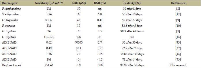 8. Reshetilov AN, Trotsenko JA, Morozova NO, Iliasov PV, Ashin VV. Characteristics of Gluconobacter Oxydans B-1280 and Pichia Methanolica MN4 cell based biosensors for detection of ethanol. Process Biochem 2001;36:1015–20.