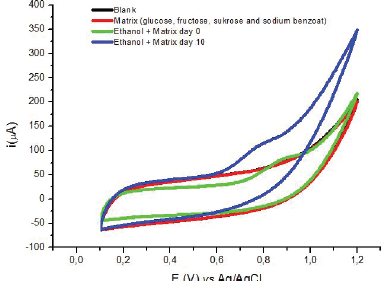 Measurements in real samples were made by three times repetition (n = 3), in the range of +0.1–1.2 V using beer pilsener with a content of ±4.7%. Beer samples were diluted using PBS pH 6.8 50 mM to ±1%.