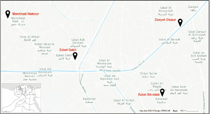 | Figure 1: Map showing the collection sites (Zawyet Ghazal: location 1, Ezbet Siknidah: location 2, Ezbet Qabil: location 3, and Manshaat Hamour location 4). [Click here to view] |