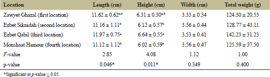 The morphometric characters of S. rubens collected from Zaweyt Ghazal (first location), Ezbet Siknidah (second location), Ezbet Qabil (third location), and Manshat Hamour (fourth location) on Al-Mahmoudia canal are summarized in Table 2. The length and height of the collected samples from the different locations showed slight significant differences. The length of the samples ranged from 11.12 to 11.97 cm and the height ranged from 6.02 to 6.64 cm, while there are no statistical differences between the total weight and width of the samples.