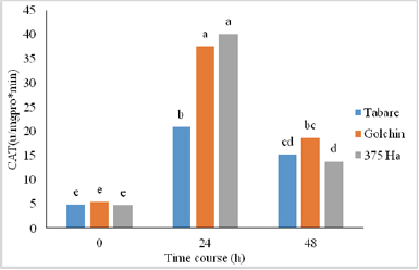 Based on the mean comparison results, the catalase component had a significant increase in NaCl stress at 24 and 48 hours after stress applied to all genotypes. However, this increase was greater at 24 hours, comparing to 48 hours. This increase at 24 hours was significantly higher in tolerant and semi-tolerant genotypes, comparing to the sensitive genotype (Fig. 1).