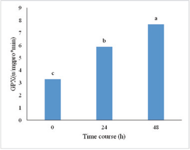 Guaiacol peroxidase components were higher under salinity stress, comparing the lack of stress and by the increase in the time after the stress, it had a significant increase so that the highest rate of this enzyme after 48 hours after stress (7.7 mgpro*min) was more than double the amount comparing to the lack of stress condition (3.3 mgpro*min). (Fig. 3) Studies have shown that to deal with the toxic effects of oxidative stress, the plants used a series of mechanisms and using peroxidase and catalase enzyme system are two main systems in order to prevent cellular damages due to the stress [25]. In accordance with the results in this study, other studies also show that this enzyme functions as a defense mechanism in plants under stress condition [26].