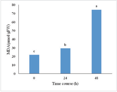 There was no significant difference observed in the studied genotypes in malondialdehyde rate. However, there was a significant difference found in the NaCl stress condition at 1 percent. This significant difference is shown in Figure 4. As it could be observed, as time passes, the malondialdehyde rate increases and it reaches its maximum after 48 hours after stress application. The malondialdehyde components show the cellular damage rate in the plant. The salinity stress in Flax leads to an increase in malondialdehyde rate and as a result, the increase in the cellular damage in the studied cultivars [23]. There is a direct relationship between lipid peroxidation and membrane damages due to the salinity stress and this rate is lower in the more tolerant cultivars, comparing to the sensitive cultivars [23].