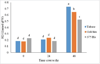 As it could be observed from the diagram of mean comparison related to the interaction of genotypes and stress time on the hydrogen peroxide (Fig. 5), 48 hours after the salination stress application, H2O2 rate had a significant increase and this increase is higher in sensitive genotypes, comparing to the tolerant genotypes. Increase in hydrogen peroxide due to salinity stress has been reported in many plants [7,23,26,27]. Hydrogen peroxide is capable of reacting to superoxide and forming more hydroxylated radicals, that in turn leads to higher peroxidation of lipid [26,28].