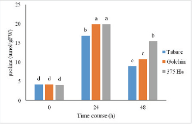 Increase in proline in this study, especially 24 hours after the stress, shows the importance of this material in salinity stress condition in the Flax plant. Increase in the leaf proline in salinity stress condition in Flax has been also reported by Moadei Dehnavi et al. [27], According to the researchers, this increase is due to the fact that proline omits the free oxygens produced in stress and protects the larger molecules [30] and helps with preserving the shape and natural structure of macromolecules in stress conditions [31].