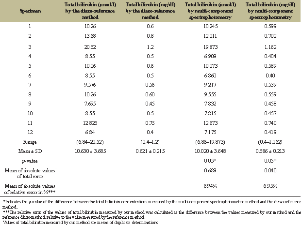 | Table 4: The total bilirubin concentrations in normal adult human sera as determined by the multi-component spectrophotometric method and diazo-reference method. [Click here to view] |
