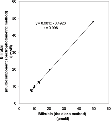 Furthermore, the method allows the determination of total bilirubin with high accuracy, sensitivity, and reproducibility, by using only distilled water as a solvent. Moreover, it yields results of TB, which are in agreement with those determined by the reference diazo-method, confirming the validity of our assay to determine the TB, by using only distilled water as a solvent, which represents an advantage of the new method from the economic point of view, as compared to previous methods [6–9]. Furthermore, the method allows measurement of TB by using the conventional spectrophotometer rather than the expensive LEICA bilirubinometer used in a previous study [14], which represents an advantage of this method from the economic point of view.