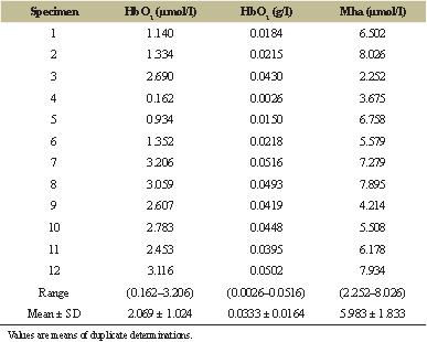 | Table 5: The oxyhemoglobin (HbO2) and methemalbumin (Mha) concentrations in normal adult human sera, using the multi-component spectrophotometric method. [Click here to view] |