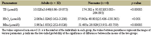 The level of plasma Mha is elevated after severe intravascular hemolysis and in some patients with hemorrhagic pancreatitis. It is formed by the breakdown of hemoglobin to hematin which combines with albumin to give Mha. Determination of Mha by this method is important for the diagnosis of patients with intravascular hemolysis and hemorrhagic pancreatitis who showed an elevation in this pigment concentration in their plasma [28,32,33]. As shown in the present study, Mha concentration is significantly higher in neonates with hemolytic jaundice as compared to healthy adults.
