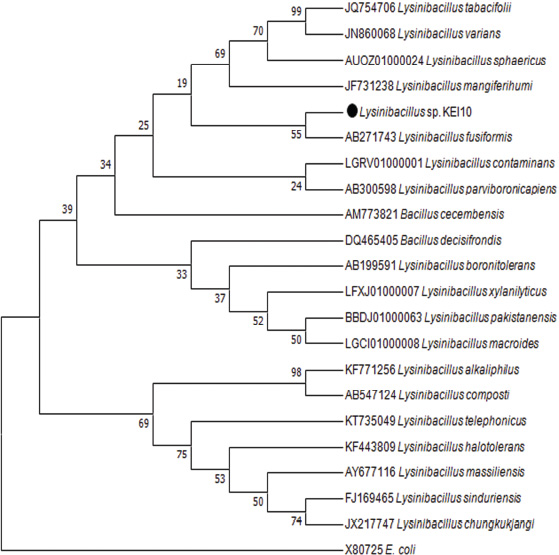Amplified 16S rRNA gene sequence of KEI10 submitted in EZ BioCloud (https://www.ezbiocloud.net/identify) for identification showed the nearest matched bacteria was Lysinibacillus fusiformis with 98.10% similarity, indicating that KEI10 may be a new species of Lysinibacillus genera. However, we will designate isolate KEI10 as Lysinibacillus sp. KEI10. Twenty nearest matched and validly published sequences were downloaded from the EZ BioCloud system and used for the formation of a phylogenetic tree. Out of 20, only the last 2 sequences were of Bacillus and the rest of the sequences were of Lysinibacillus. In the phylogenetic tree, Lysinibacillus sp. KEI10 clusters with L. fusiformis, also isolated from the soil [31] (Fig. 2), confirming the identification result of the EZ BioCloud system. Escherichia coli being different from Lysinibacillus and Bacillus made an outgroup, indicating the correctness of tree.