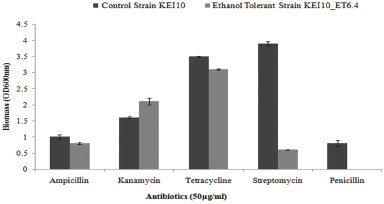 Previously, it has been reported that ethanol tolerance leads to change in the cell membrane permeability. Change in cell membrane permeability is associated with differential expression of the multidrug resistance gene. Therefore, it could lead to change in the degree of resistance and susceptibility of microbes toward antibiotics [37,38]. Previously, it has also been reported that overexpression of the multidrug resistance gene increases ethanol tolerance and fermentation performance in yeast [39]. In this context, antibiotic susceptibility of the ethanol-tolerant strain KEI10_ET6.4 was tested for ampicillin, kanamycin, tetracyclin, streptomycin, and penicillin. It was observed that for ampicillin and tetracycline, there was a very slight decline in the zone of inhibition, whereas, in case of kanamycin, there was a slight increase in zone of inhibition, which suggests that there is no differential change in susceptibility of ethanol-tolerant strain KEI10_ET6.4 toward ampicillin, tetracycline, and kanamycin. Interestingly in the case of streptomycin, there was a sharp decline in the zone of inhibition in ethanol-tolerant strain. Similarly, in the case of penicillin, no zone of inhibition could be measured (Fig. 5). This indicates that the ethanol tolerant strain has gained resistance for both streptomycin as well as penicillin at a concentration of 50 μg/μl.