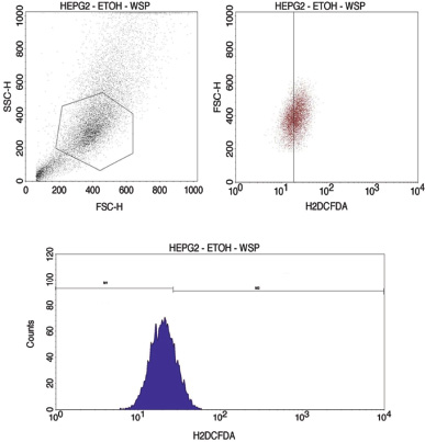 In the present study, we determined the impact of WSP on ROS level in HepG2 cells by incubating with and without 56.57 mM EtOH independently for a period of 24 hours and then treating the cells with 150 μg/ml WSP and 250 μM SIL independently for a period of 24 hours. Later the cells were stained using H2DCFDA dye and ROS in the cells were quantified by FACSCalibur flow cytometer (BD Biosciences, San Jose, CA).