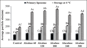 ![]() | Figure 4: Average particle size of primary nanoliposomes and nanoliposomes after storage at different temperatures [Click here to view] |
