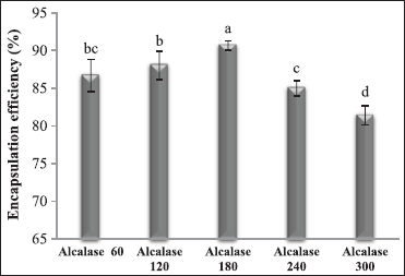 The results indicate a decrease in the amount of encapsulation efficiency in nanoliposomes loaded with peptides that are derived from the higher degrees and duration of hydrolysis. This finding suggests the effect of hydrolysis degree, as a result, faster release of peptides with a molecular weight lower than the vascular structure, and ultimately the decreased amount of this index [9].