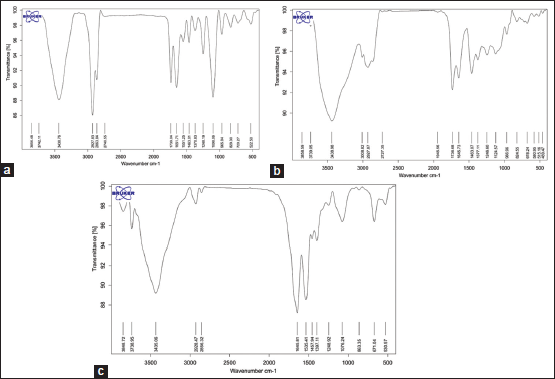 ![]() | Figure 7: Fourier-transform infrared spectroscopy in the pure peptides (a), empty nanoliposomes (b), and peptide-loaded nanoliposomes (c) [Click here to view] |