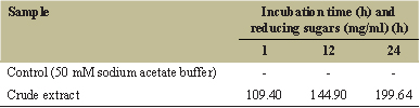 The sample from cotton waste treated with crude cellulase was yield measurable reducing end groups from cotton carbohydrates. Table 2 shows the time dependence of reducing sugar liberation during the crude enzymatic treatment. Csiszar et al., 2001, reported that the amount of released reducing sugar by cellulase and hemicellulase enzymes increases with the time of enzymatic treatment [20]. The present investigation also shows the same result; the reducing sugar production from sample of cotton waste treated with crude enzyme extract from P. florida compost waste was increased based on their increased reaction time.