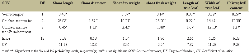 According to Table 1, the effect of treatment of chicken manure tea and vermicompost was significant on shoot length and stem diameter at 1% level. The control group showed a statistically significant difference with other treatments. Control treatment with 3.03 cm, the lowest and chicken manure tea 50% (v/v) have the highest length of shoot seedling. Data showed that stem diameter increased significantly during the time due to treatment. The highest shoot diameter was observed in the treatment with chicken manure tea 50% (v/v) [Figure 1]. Vegetative growth in plants is affected by several factors, which water availability is one of the most important. The effects of vermicompost and its extract on vegetative growth of plants, humic, fulvic, and other organic acids also have a positive effect on vegetative growth, stimulating shoot length, and stem diameter [10]. The stem also may represent a huge volume for storage of photosynthetic materials and then the remobilization of photosynthetic materials into fruits. Some growth regulators such as indole-3-acetic acid (auxin) have increased plant height using organic fertilizers [10,11]. The results of this study agree with those observed in Crossandra undulaefolia [12], radish [10], Calendula officinalis, and strawberries [11].
