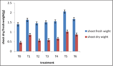 | Figure 2: Changes in shoot dry/fresh weights in cucumber seedling treated with chicken manure tea and vermicompost; (T0): Without any fertilizer, (T1): Chemical fertilizer (20-20-20), (T2, T3): Vermicompost (20 and 30% [V/V]) and (T4, T5, and T6): Chicken manure tea (25, 50, and 75% [V/V]); (error bar indicate standard deviation) [Click here to view] |