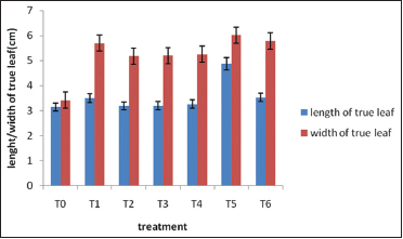 | Figure 3: Changes in length/width of true leaf in cucumber seedling treated with chicken manure tea and vermicompost; (T0): Without any fertilizer, (T1): Chemical fertilizer (20-20-20), (T2, and T3): Vermicompost (20 and 30% [V/V]) and (T4, T5, and T6): Chicken manure tea (25, 50, and 75% [V/V]); (error bar indicate standard deviation) [Click here to view] |