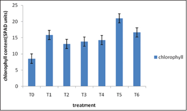 | Figure 4: Changes in chlorophyll content in cucumber seedling treated with chicken manure tea and vermicompost; (T0): Without any fertilizer, (T1): Chemical fertilizer (20-20-20), (T2, and T3): vermicompost (20 and 30% [V/V]) and (T4, T5, and T6): Chicken manure tea (25, 50, and 75% [V/V]); (error bar indicate standard deviation) [Click here to view] |