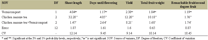 ANOVA for different traits as influenced by chicken manure tea and vermicompost level is given in Table 1. The Chicken manure tea showed a statistically significant difference with control.
