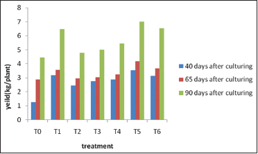 The effect of treatment on the shoot length, days until flowering, yield (40, 65, and 90 days after culturing), marketable fruit ratio to second degree fruit and total fruit weight was significant [Table 2].
