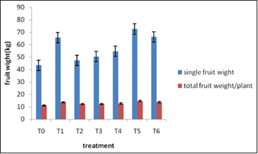 | Figure 8: Changes in total fruit weight in mature cucumber seedling treated with chicken manure tea and vermicompost; (T0): Without any fertilizer, (T1): Chemical fertilizer (20-20-20), (T2, and T3): Vermicompost (20 and 30% [V/V]) and (T4, T5, and T6): Chicken manure tea (25, 50, and 75% [V/V]); (error bar indicate standard deviation) [Click here to view] |