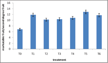 | Figure 9: Changes marketable fruit/second degree fruit in mature cucumber treated with chicken manure tea and vermicompost; (T0): Without any fertilizer, (T1): Chemical fertilizer (20-20-20), (T2, and T3): Vermicompost (20 and 30% (V/V)) and (T4, T5, and T6): Chicken manure tea (25, 50, and 75% (V/V)); (error bar indicate standard deviation) [Click here to view] |