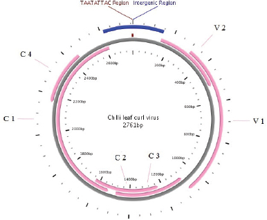 The chili (Capsicum annuum) is an economically important and widely cultivated vegetable cum spice crop of the family Solanaceae. Various pathogens affect the chili crop and limit its production [1–3]. Viruses are the main cause of loss in chili production. Around 65 viruses are known to cause leaf curl disease in chilies (ChiLCD) throughout the world, among which begomoviruses (family-Geminiviridae) are one of the most destructive plant viruses [4]. ChiLCD is characterized by curling of leaves, thickening, and swelling of veins, reduced leaf size, and stunted plant growth [5,6]. Geminiviruses are non-enveloped, circular, single-stranded DNA viruses having one (DNA-A, monopartite) or two (DNA-A and B, bipartite) DNA molecule of 2.5–3.0 kb size with nine genus, namely, Becurtovirus, Begomovirus, Capulavirus, Curtovirus, Eragrovirus, Grablovirus, Mastrevirus, Topocuvirus, and Turncurtovirus [7]. The transmission vectors of begomoviruses are Whiteflies (Bemicia tabaci) [8]. Begomovirus has bidirectionally organized six open reading frames (ORFs) on virion sense and complementary strand and an Intergenic region with the origin of replication [9]. Sense strand has V1 (CP: Coat Protein), V2 (Pre-CP: Pre Coat Protein) ORFs and C1 (Rep: Replication associated protein), C2 (TrAP: Transcriptional activator protein), C3 (REn: Replication Enhancer protein), and C4 ORFs are present on complementary strand [10].