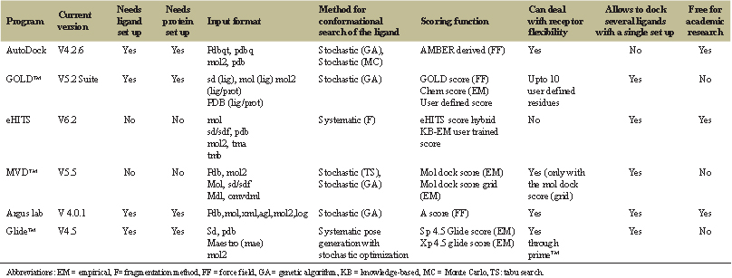 | Table 1: Key attributes of some chosen protein–ligand docking programs. [Click here to view] |