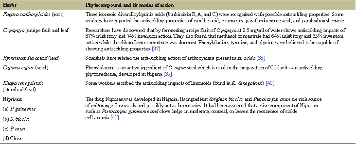 Various plant species show antioxidant treatment vital for the counteractive action of thick cell arrangement and free radicals preventing oxidative cell damage leading to prolongation of red blood cell life [35]. Table 2 enlists some of the important plants used in cure and prevention of sickle cell disease.