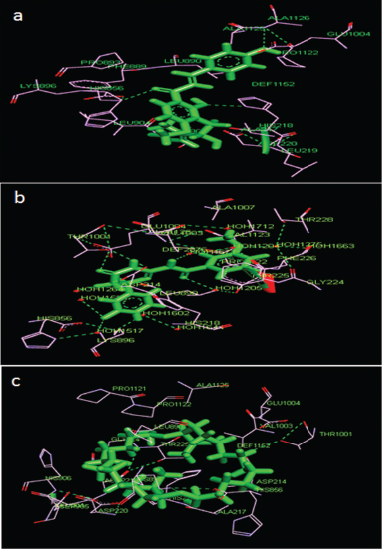 ![]() | Figure 4: Interactions of the ligand (a) Xanthoangelol D, (b) N-[(4R)-4-(3-fluorophenyl)-6-oxo-4,5-dihydro-H-pyrimidin-2-yl]-3-methoxybenzamide, and (c) Carpaine with binding site residues of sickle cell protein (PDB ID:2HBS). [Click here to view] |