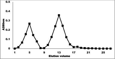 The pattern of separation of purified protein by gel filtration showed a single band of 60.2kDa molecular weight (Figure 8). Seraj et al. [17] reported a molecular weight of 61 kDa antibacterial protein from the American cockroach, P. americana. Similarly, Rethna Priya [45] reported a 77 kDa antibacterial protein molecule in Clibanarius clibanarius. Morishima et al. [46] reported a peptide of 6 1 kDa in Bombyx mori, and a 64 kDa in Hyalophora cecropia [47].