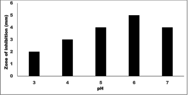 The effect of pH was studied by varying pH ranges pH 3.0, 4.0, 5.0, 6.0, and 7, respectively. The reaction mixture contains 50 µl AMP aliquot added with 50 µl phosphate buffer of different pH, well mixed and incubated for 15 minutes at room temperature, and assayed for antibacterial assay.