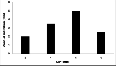 50 µl of the purified AMP sample was mixed with 50 µl of different concentrations of calcium, namely, 3, 4, 5, and 6 mM were added and gently mixed well and incubated for 20 minutes. The sample was poured in petri dishes, and antimicrobial assay was carried out.