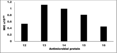 The active purified peptide chromatographic fraction was used to determine MIC in culture media. The MIC increased with an increase in microbial peptide concentration (Fig. 5). The highest value of MIC was observed in F13 (Fig. 6). The E. coli growth reduced to 57.05% at 100 µg and to 93.86% by 200 µg. The percentage inhibitory activity of purified protein against E. coli showed that the peptide was active against E. coli at a lower concentration of 4.5 × 10−03 mM in F16 and a higher concentration of 1.115 × 10−03 mM in F13. In G. mellonella, immune hemolymph defensing-like peptide inhibited bacterial growth at a concentration of 2.9 and 1.9 µM [36]. Liu et al. [37] reported inhibition of bacterial growth at a concentration of 50–200 µM depending on the isoforms.