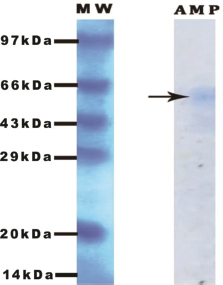 Figure 8: Molecular weight of AMP calculated by SDS-PAGE. Lane 1 shows Standard molecular weight markers, and lane 2 shows the purified AMP molecular weight.