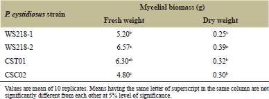 ![]() | Table 1: Yield of mycelial biomass of the four strains of P. cystidiosus grown in liquid culture using coconut water medium after 15 days of incubation. [Click here to view] |