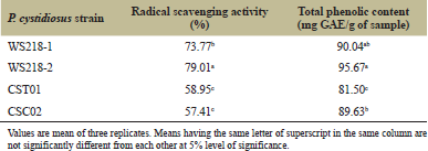 ![]() | Table 2: Radical scavenging activity and total phenolic content of the four strains P. cystidiosus mycelia. [Click here to view] |