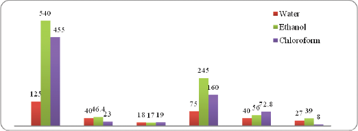 | Chloroform | 455 ± 0.25 | 23 ± 1.678 | 19 ± 0.245 | 160 ± 0.09 | 72.8 ± 0.45 | 8 ± 0.637 |