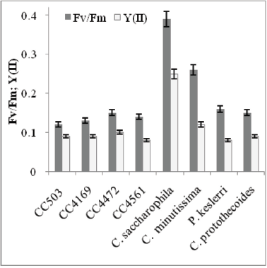 ![]() | Figure 2: Chlorophyll a fluorescence analysis for intact chloroplast from different green algae showing positive values of Fv/Fm (?) and Y(II) (?). [Click here to view] |