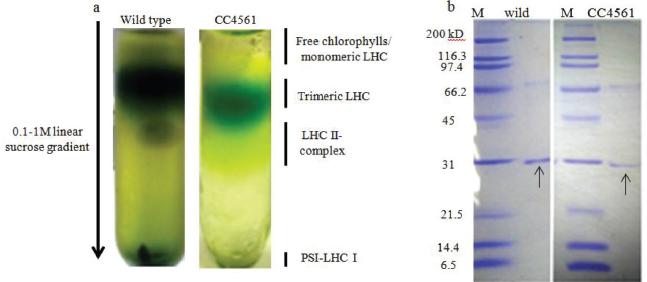![]() | Figure 3: (a) Sucrose density gradient ultracentrifugation for solubilized thylakoid membranes showing top band of free chlorophylls and monomeric LHCs followed by green band of trimeric LHC, (b) Nondenaturing PAGE for the qualitative detection of LHC trimers showing 31kD trimeric LHCs indicated by arrows (figures right to left for wild type and truncated light harvesting antenna mutant CC4561of C. reinhardtii). [Click here to view] |