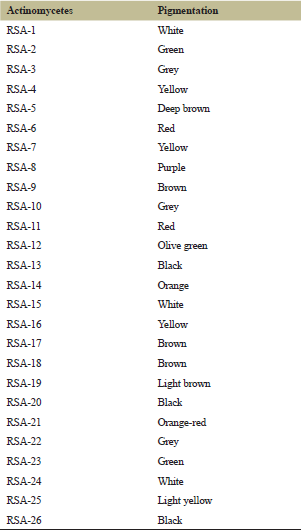 ![]() | Table 1: Isolates of pigment producing Actinomycetes. [Click here to view] |