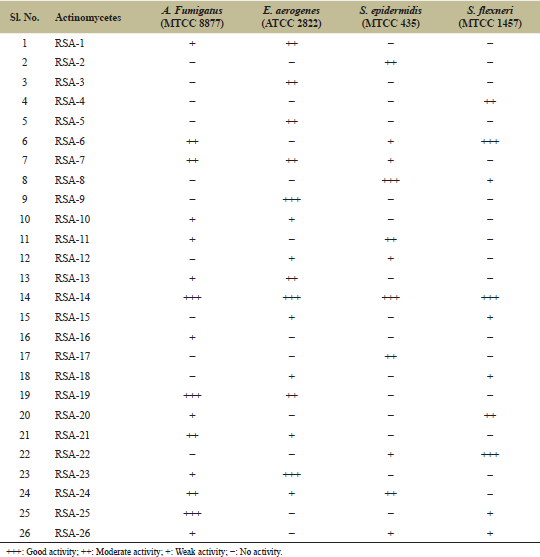 | Table 2: Activity of isolated strains against different test pathogens. [Click here to view] |