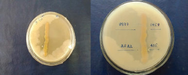 | Figure 2: Zone of growth inhibition by cross streak-plating technique from isolated strain RSA-14. A. fumigatus (MTCC 8877), E. aerogenes (ATCC 2822), S. epidermidis (MTCC 435), and S. flexneri (MTCC 1457). [Click here to view] |