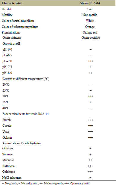 | Table 3: Morphological, physiological and biochemical characteristics of the strain RSA-14. [Click here to view] |